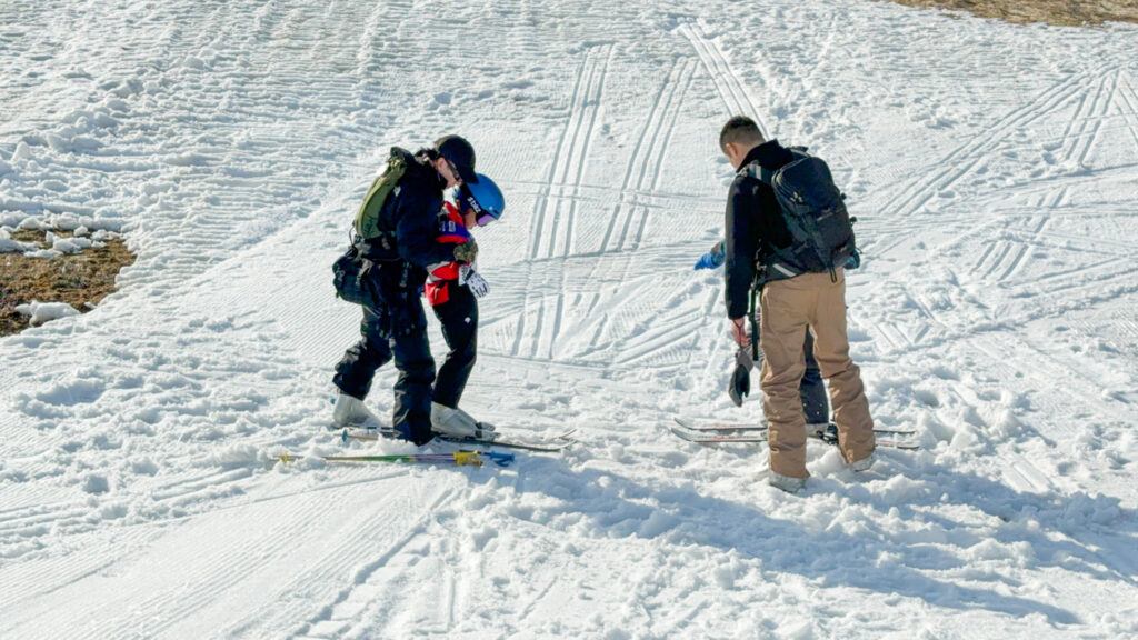 今回初めてスキーをする子ども達は、まずはスキー板の履き方や基本の姿勢を確認し、なだらかな傾斜のある場所での滑走練習に挑戦しました。はじめこそ不安がっていたものの「転んだけど楽しい!」と笑顔を見せ、何度もチャレンジを繰り返していました。