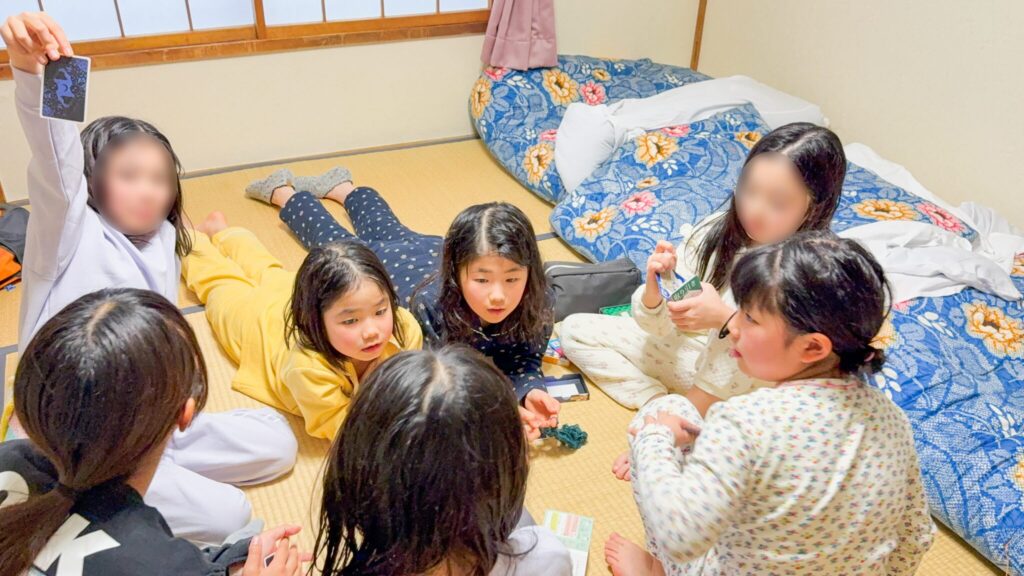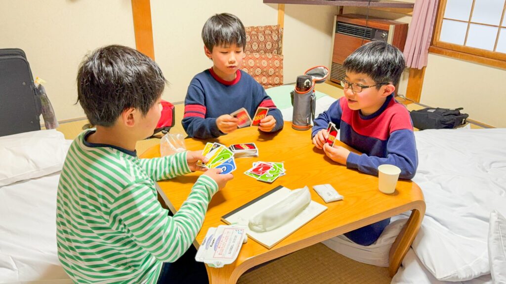 夕食後や就寝前の自由時間には、UNOやトランプ等のカードゲームで盛り上がったり、宿のピアノを弾いたりと、和やかに交流を深めました。 自分たちで布団を敷き、明日の準備をしっかりと終えた後、子どもたちは「明日はもっと滑りたい!」と翌日からの本格的なレッスンへの期待をふくらませながら、穏やかに眠りにつきました。