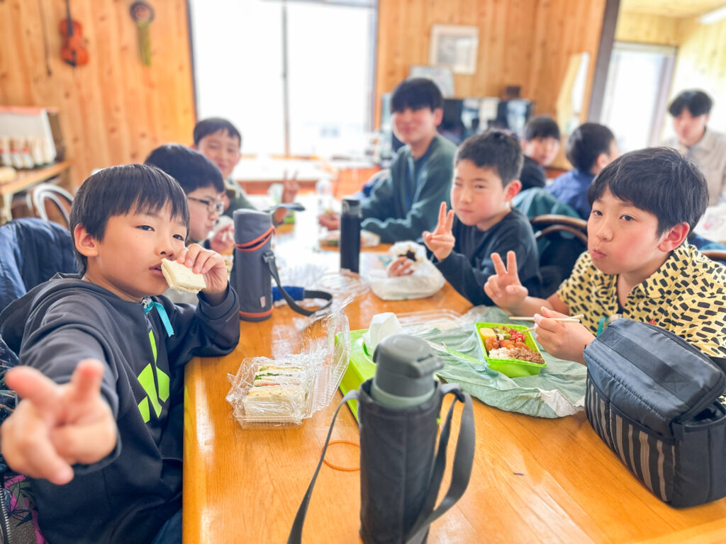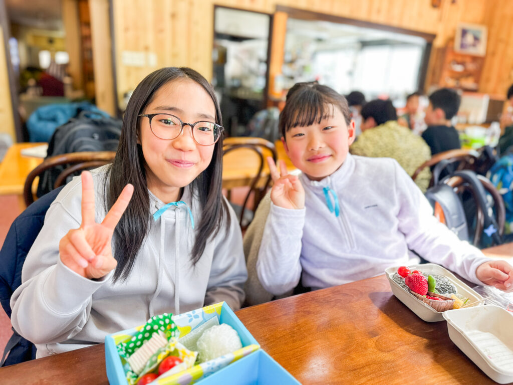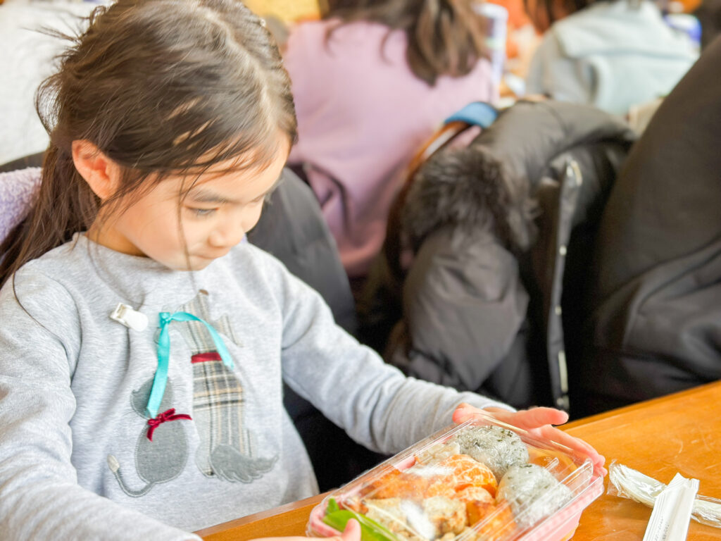 宿に到着すると、まずは保護者の方が用意してくださったお弁当で昼食をとります。お互いのお弁当を見せ合いながら楽しく昼食の時間を過ごしつつ、スキーに向けたエネルギー補給もばっちりです。