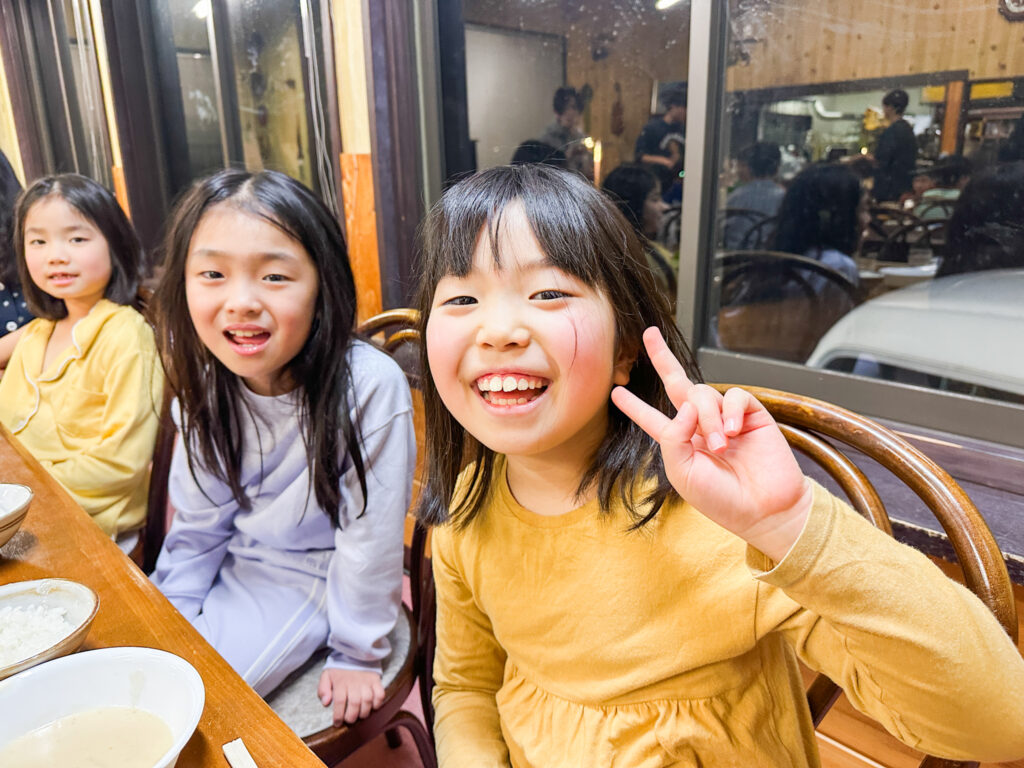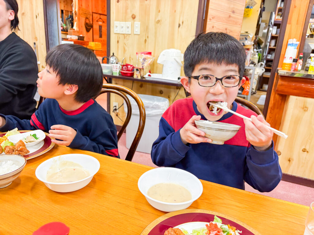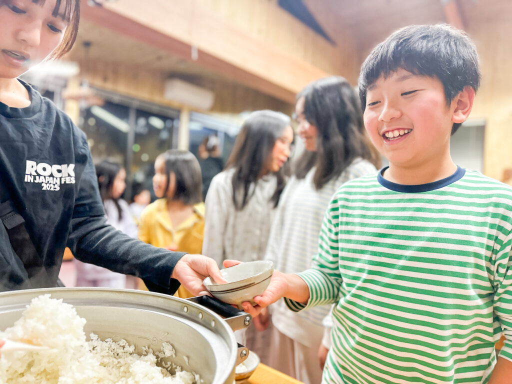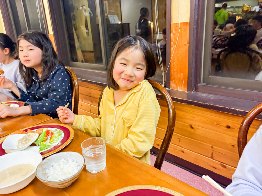 宿に戻った後は、順番に入浴を済ませ、夕食の時間です。体をたくさん動かした後の食事とあって、ご飯を何回もおかわりして、お腹いっぱい食べる子どもたちの姿が多く見られました。