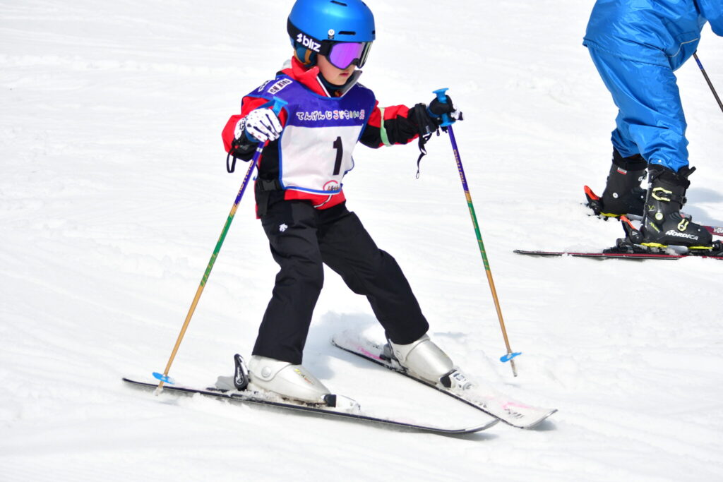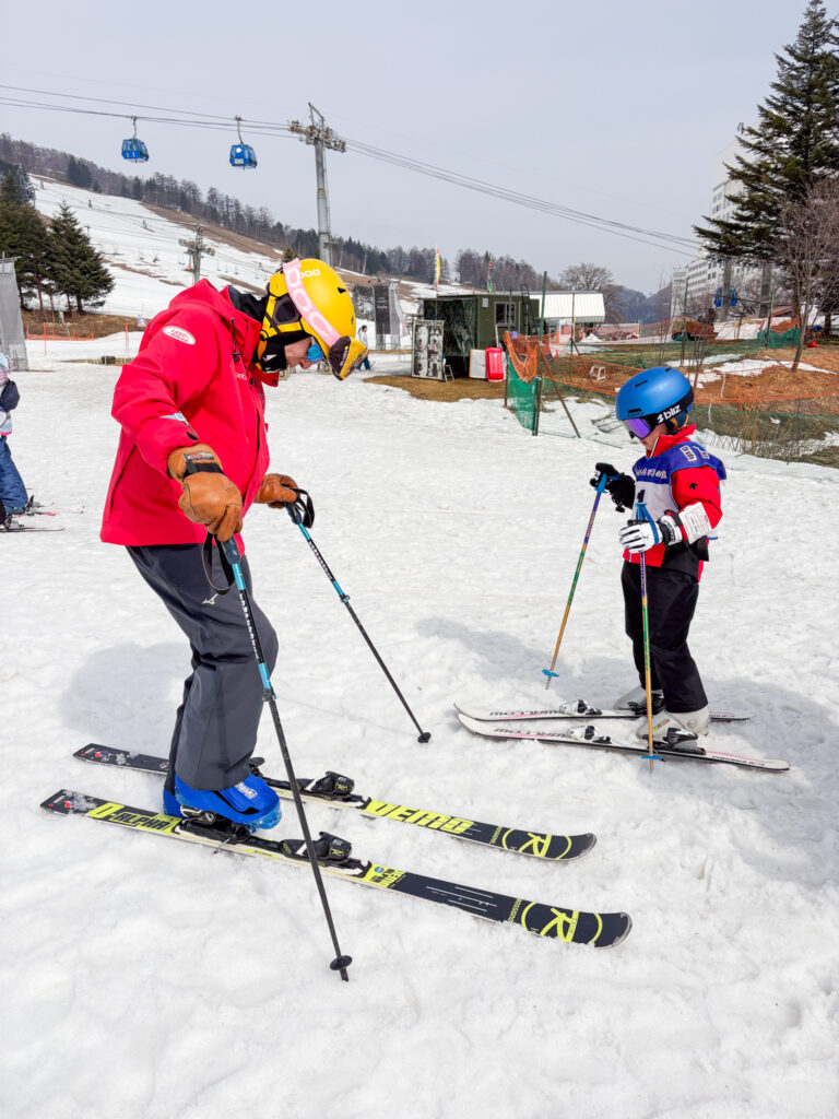初級グループは、板の付け方やストックの扱い方をおさらいした後、まず「ハの字」でしっかり止まることを重点的に練習します。インストラクターの丁寧なアドバイスを受けながら、繰り返し何度も挑戦します。徐々に自分の足でしっかりと止まれるようになり、自分たちの成長に目を輝かせていました。