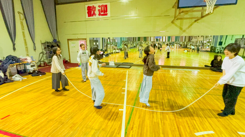 午前中は宿に併設されている体育館をお借りして、元気いっぱいに体を動かしました。違う学校や異なる学年のお友達にも自分から積極的に声を掛け合い、みんなでドッジボールやバレーボール、大縄跳びなどを楽しみました。お友だちの輪を広げながら、各々がその場でできる遊びを考えます。